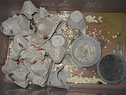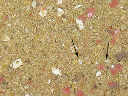 vous pouvez voir 2 oeufs à travers la poudre de moulée. Les morceaux